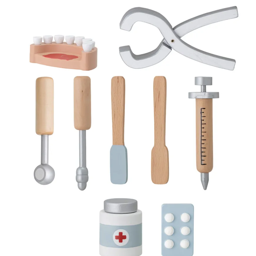 Mit diesem schönen Spiel-Set aus dem Hause Bloomingville können sich kleine Mädchen und Jungen als Zahnärzte probieren. Eine umfangreiche Ausstattung inklusive eines Gebisses, allerlei Werkzeug und Medikamente sorgen für ein authentisches Spielerlebnis. Eine harmonische Farbgebung und hübsche Details machen das hochwertige Holzspielzeug von Bloomingville zum Blickfang.