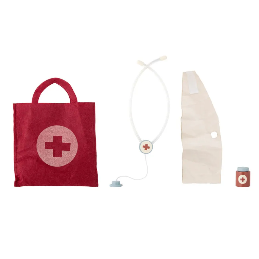 Mit dem schönen Bloomingville Spielset eröffnet der Nachwuchs seine eigene Arztsprechstunde. Kranke Puppen und Stofftiere erhalten damit schnelle Hilfe. Das Stethoskop unterstützt beim Abhören und der Verband lässt sich vielseitig nutzen. Medikamente bekommen die Patienten aus der kleinen Dose. Für Termine außerhalb des Kinderzimmers packt der Doktor seine Utensilien einfach in die praktische Bloomingville Erste-Hilfe-Tasche.