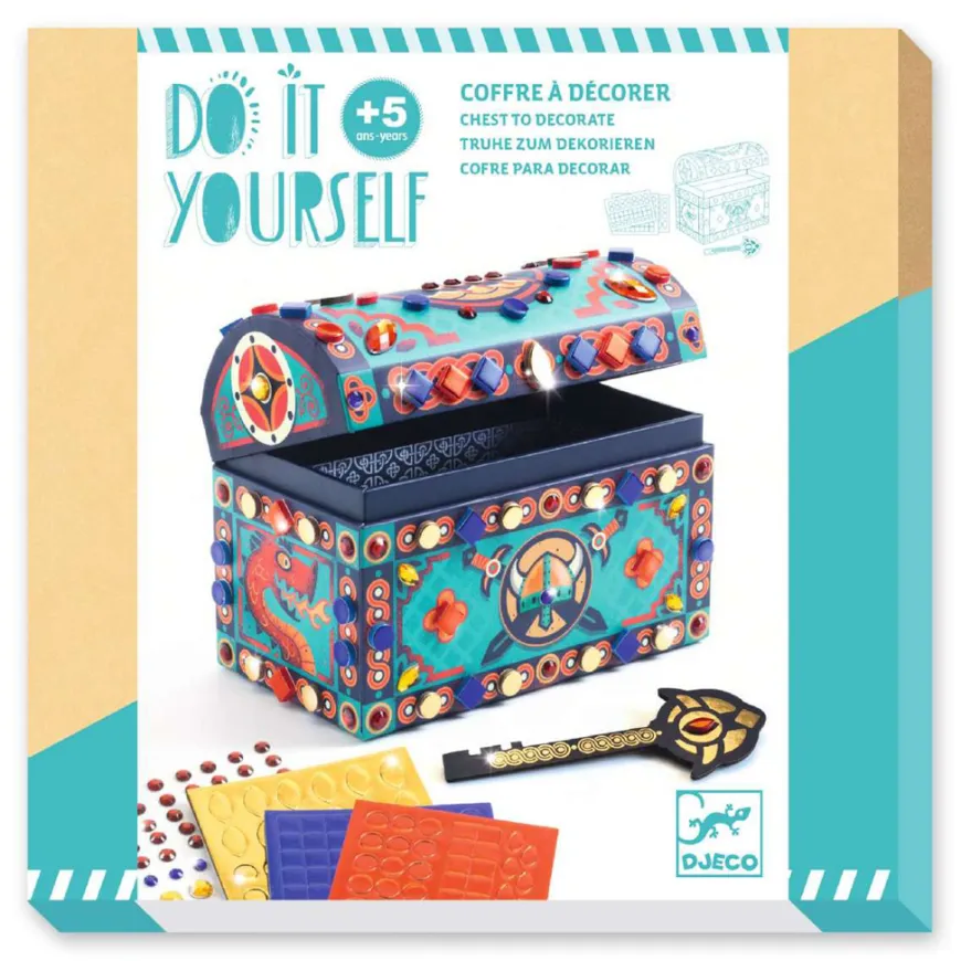 Eine elegante Djeco Truhe, die mit mehr als 150 Mosaikaufklebern und selbstklebenden Strasssteinen verziert werden kann. Der doppelte Boden der Djeco Truhe öffnet sich mithilfe des Schlüssels und bietet Zugang zu einem unsichtbaren Versteck, in dem die Kinder ihre wertvollsten Geheimnisse verbergen können.