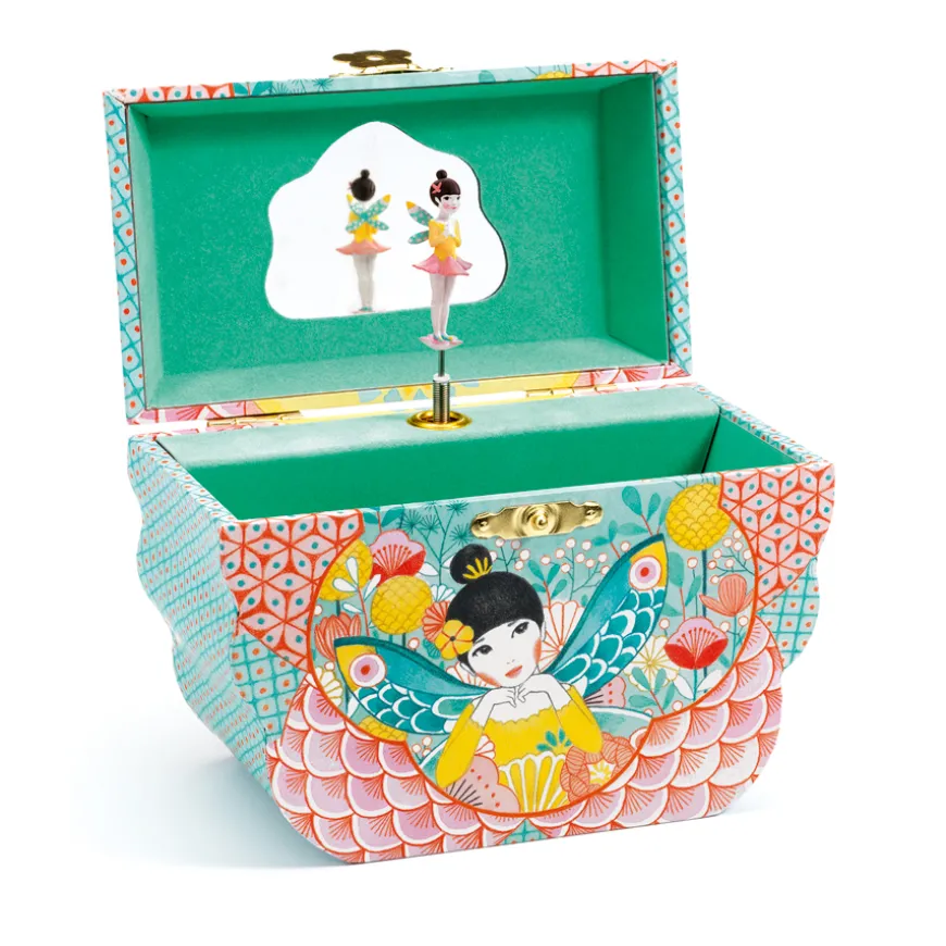 Das Djeco Musik-Schmuckkästchen Blumige Melodie ist ein Kunstwerk für sich. Schillernde Farben, aufwendige Motive und eine kleine Figur, die im Inneren des Kästchens thront – dieses Modell ist der perfekte Dekoartikel. Das Djeco Musik-Schmuckkästchen passt gut auf wertvolle Schätze auf und lässt kleine Mädchenaugen bei jedem Anblick leuchten!