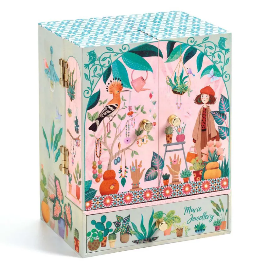 Das Djeco Musik-Schmuckkästchen Secret Garden erinnert an einen verwunschenen Zauberwald. Neben einer wunderschönen Spieluhr befinden sich in dem geheimen Garten eine kleine und eine große Schublade für Schmuck. Zwei Ringhalter sowie vier goldene Haken für Armbänder und Halsketten runden das Design perfekt ab. Auch der kleine Spiegel und eine hübsche, zur Musik tanzende Ballerina verwandeln dieses Djeco Schmuckkästchen in ein traumhaftes Kunstwerk.