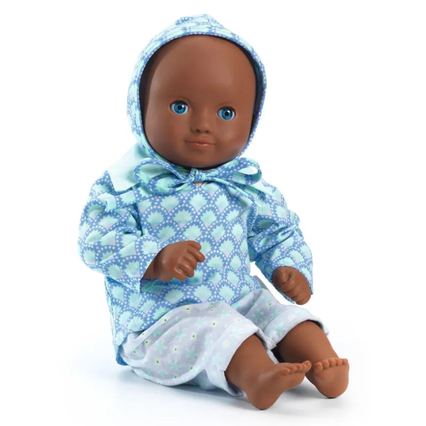 - 1 Puppe Größe 32 cm (Körper aus Stoff und Kopf, Arme und Beine aus Vinyl), 1 Hose, 1 Langarmshirt und 1 Mütze.