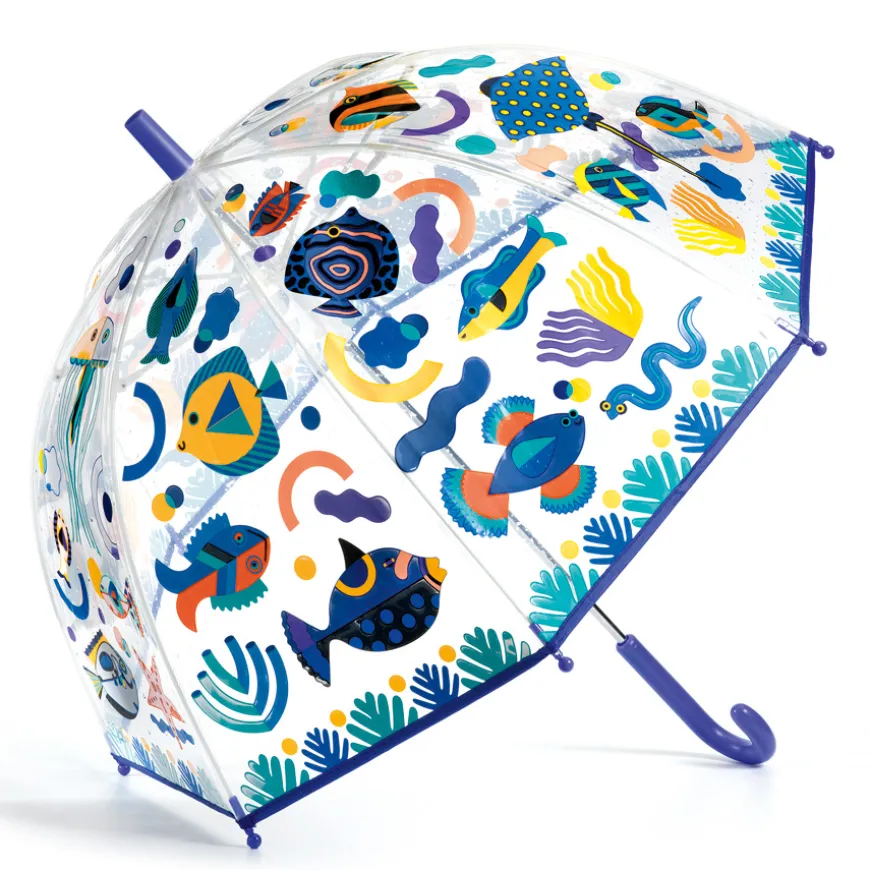 Ab nach Draußen mit dem Djeco Regenschirm Fische! Die lustigen Fische sorgen für gute Laune und der Djeco Regenschirm bietet noch eine Überraschung: Wird der Regenschirm nass, verändert sich die Farbe.