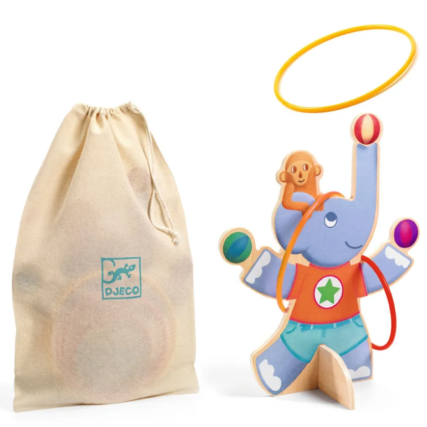 Dieses Djeco Ringwurfspiel bringt Abwechslung in das Kinderzimmer. Wer schafft es, die kleinen und großen Ringe so zu werfen, dass der Elefant sie fangen kann? Für den gutmütigen Riesen ist das eine besondere Aufgabe, wird er doch nebenbei vom lustigen Djeco Affen abgelenkt.