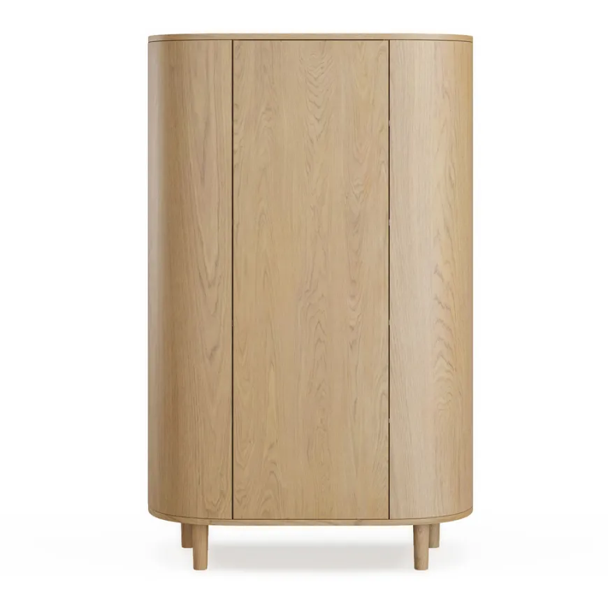 Dieser hübsche Kleiderschrank aus dem Hause Kas Kopenhagen vereint elegante, ovale Form mit durchdachter Funktionalität und ist somit eine Aufbewahrungslösung, die über Generationen hinweg genutzt werden kann. Perfekt für Kinder- oder Schlafzimmer, bringt er Ordnung und Eleganz in jeden Raum.Der Kleiderschrank verfügt über drei Fächer mit insgesamt 12 Einlegeböden – ideal für die Aufbewahrung von Kleidung, Schuhen und Accessoires. Er lässt sich mühelos per Touch-Funktion öffnen und sorgt so für einen eleganten und modernen Look.Zusätzlich ist der Kleiderschrank mit einer praktischen Kleiderstange ausgestattet, die viel Platz zum Aufhängen von Kleidung bietet.Das charakteristische Design von Kas Kopenhagen zeichnet sich durch die konischen Beine und die verdeckten Schrauben aus, die eine klare, minimalistische Ästhetik schaffen.Da Holz ein Naturmaterial ist, können Farbabweichungen und Abweichungen in Farbe und Optik auftreten. Kleine Farbunterschiede zwischen einzelnen Teilen sind ein natürlicher Bestandteil des Holzcharakters. Bitte beachten Sie, dass Holzoberflächen durch direkte Sonneneinstrahlung beeinträchtigt werden und mit der Zeit aufhellen können.