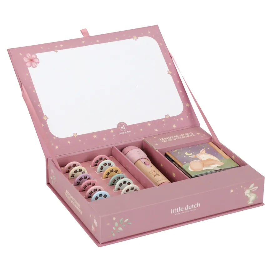 Mit der Little Dutch Projektor-Taschenlampe lassen sich Geschichten zum Leben erwecken! Diese besondere Taschenlampe enthält 12 Scheiben, jede mit ihrer eigenen Geschichte, die durch wunderschöne, einzigartige Illustrationen zum Leben erweckt wird, die Sie an die Wand projizieren. Jede Geschichte wird durch ein passendes Heft mit den Illustrationen ergänzt. Die Little Dutch Projektor-Taschenlampe kann durch Batterien betrieben werden und ist so perfekt für die nächste Reise.