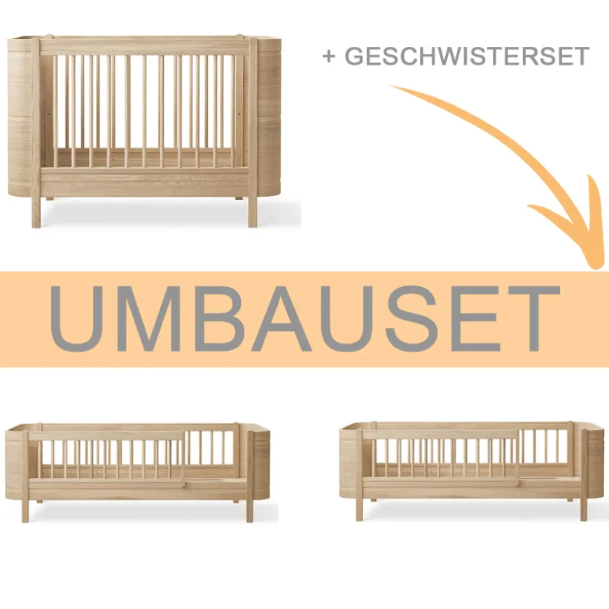 Zum 20-jährigen Jubiläum hergestellt aus exklusiver Eiche: Oliver Furniture Umbauset Wood Mini+ Babybett inkl. Umbauset Juniorbett und Geschwisterset zu 2 Juniorbetten Eiche.