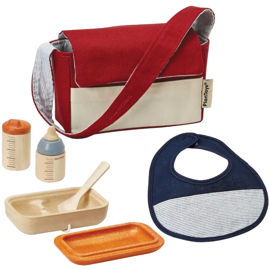 Mit der wunderschönen PlanToys Spielkombination versorgen kleine Puppenmamas ihre Lieblinge immer und überall. In der praktischen Tasche, die sich zum Anhängen an den Puppenwagen eignet, finden das Lätzchen, zwei Fläschchen sowie die Schale für den Brei samt Löffel einen Platz. Das PlanToys Fütterungsset lässt sich individuell mit kleinen Accessoires, wie einer Windel oder Tüchern ergänzen.
