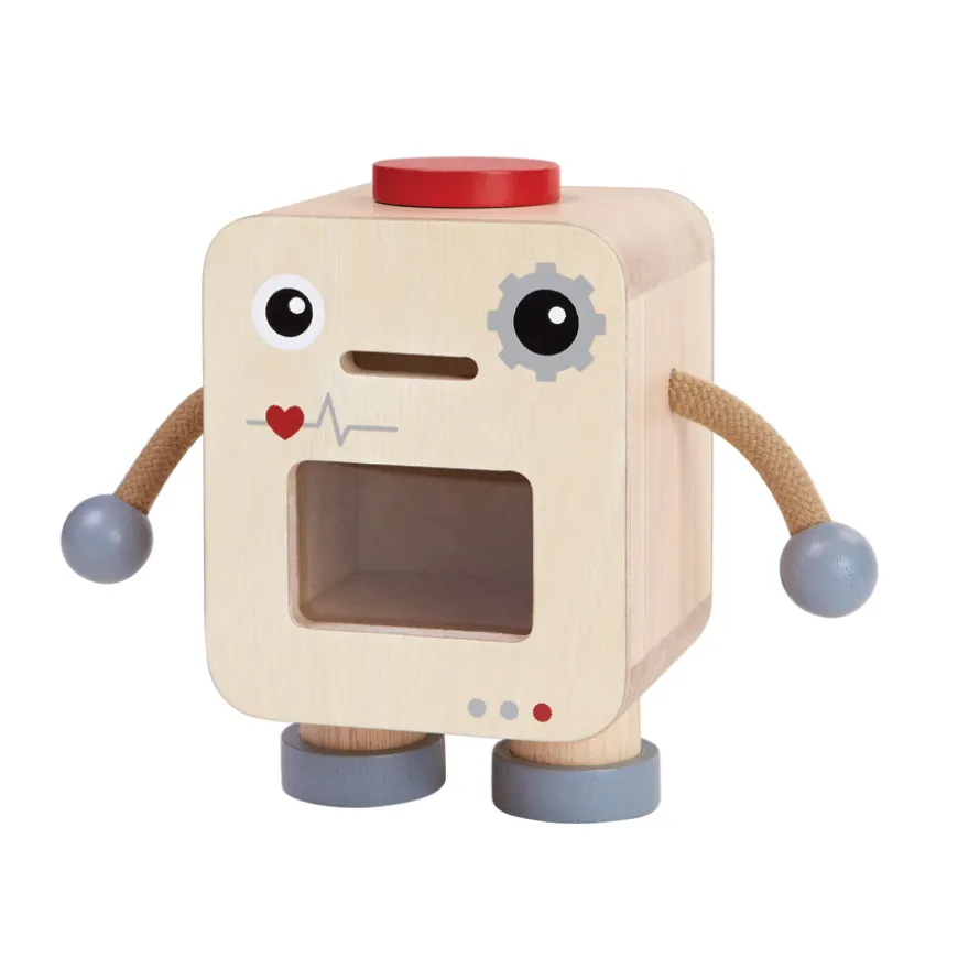 Der süße Roboter der Marke PlanToys hat ein ganz großes Herz und passt auf das Taschengeld auf. Besonders praktisch ist das Sichtfenster der Spardose, welches einen Blick ins Innere erlaubt. Der PlanToys Roboter erweist sich als fleißiger Sammler und bewahrt die ihm anvertrauten Münzen in seinem Inneren sicher auf. Seinen Platz findet er auf dem Regal im Kinderzimmer oder auf der Fensterbank, wo er gleichzeitig als hübsche Deko fungiert.
