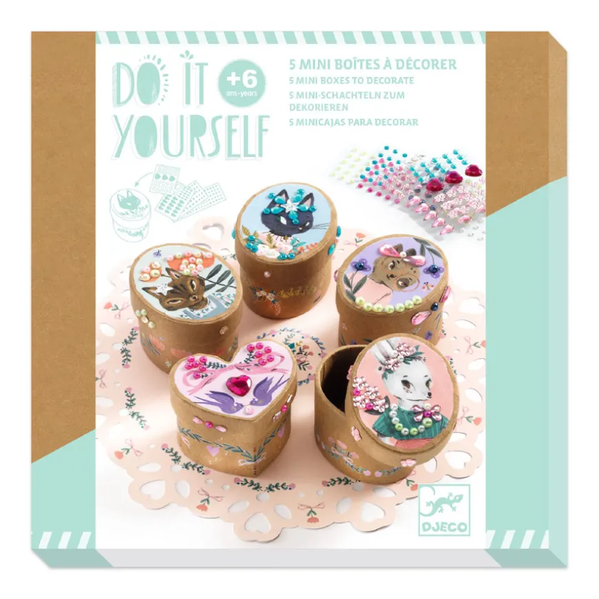 In diesen Djeco DIY Mini-Schachteln bewahren die Kleinen ihre schönsten Kostbarkeiten auf. Doch zunächst gilt es, die fünf Schachteln nach Herzenslust zu verzieren. Dabei helfen die Schmucksteine, die in zauberhaften Farben erstrahlen. Die fertigen Djeco Mini-Schachteln stehen am liebsten auf dem hübschen Spitzendeckchen – so ist das Set perfekt.