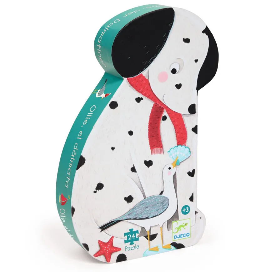 Der Dalmatiner Ollie verbringt den Tag mit seinen Eltern am Strand. Dieses farbenfrohe Djeco Puzzle mit 24 Teilen kommt in einer hübschen Box in Form eines Hundes. Das Djeco Puzzle aus dickem Karton, das beliebig oft zusammengesetzt und auseinandergenommen werden kann.