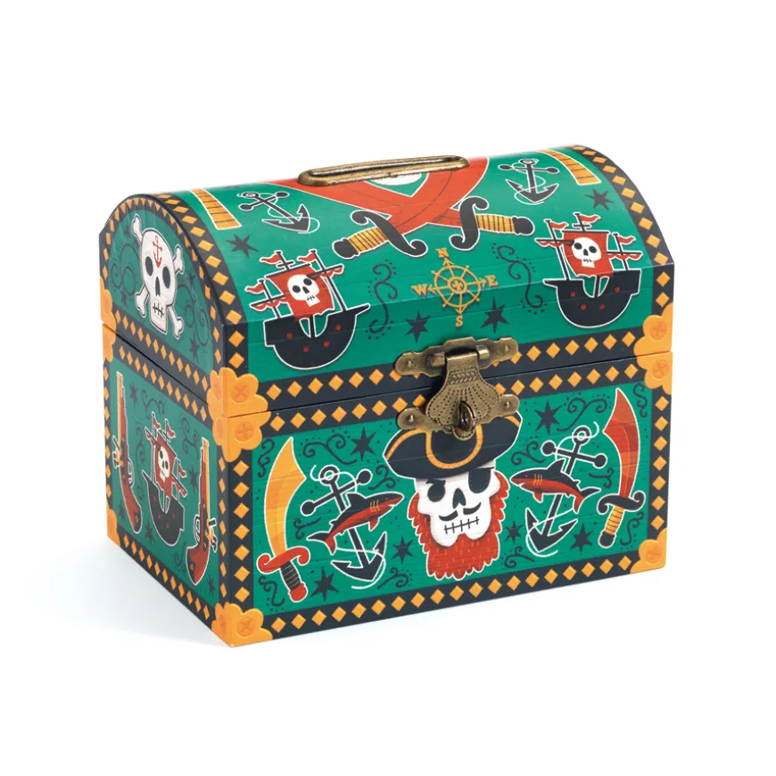 He, ho, he – wer will echte Piraten sehen? Das geht zwar auch mit dieser Spardose von Djeco nicht, aber zumindest halten unsere kleinen Freibeuter eine echte Schatztruhe in Händen. Durch einen Schlitz im Deckel wandert Münze um Münze, bis sich ein kleines Vermögen angesammelt hat. Gold und Silber, oder eben auch der ein oder andere Euro sind, dank der Spardose von Djeco, absolut sicher.