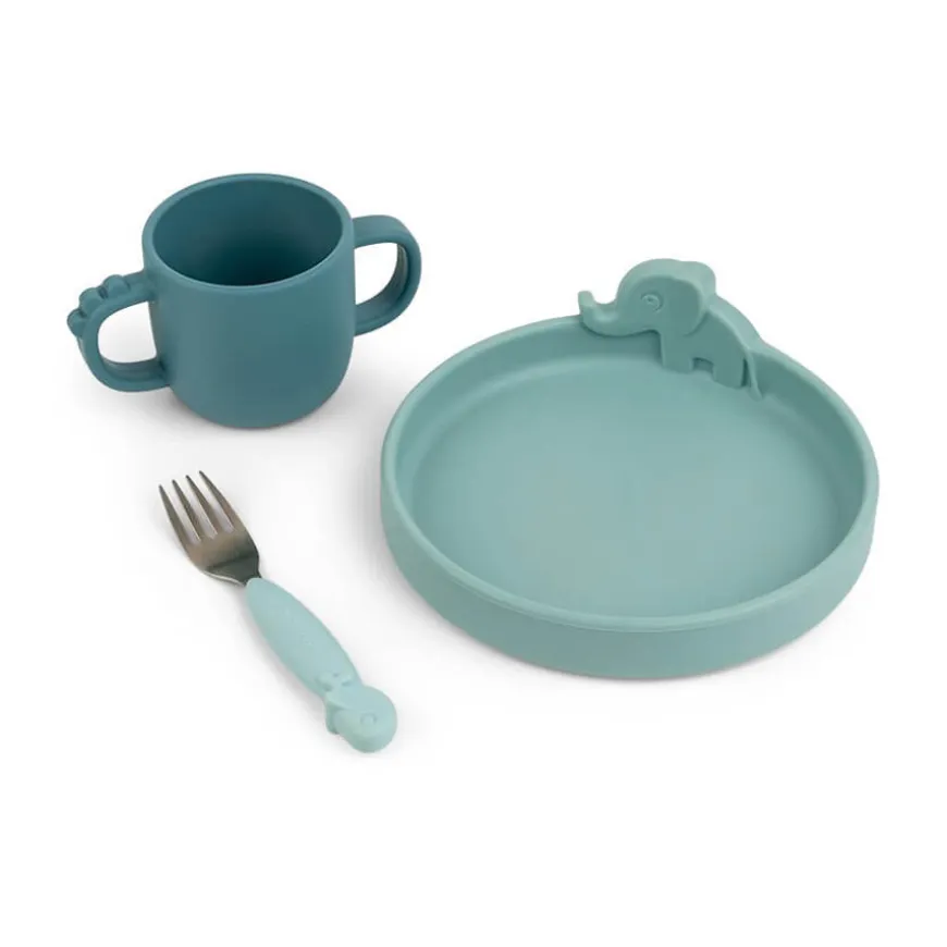 Das Done by Deer Geschirr-Set Peekaboo Deer Friends enthält einen runden Teller mit hohem Rand, eine Tasse mit zwei Henkeln und eine Gabel. Jedes Teil ist mit einem anderen Tier verziert. Farblich sind die verschiedenen Komponenten des Done by Deer Sets aber hervorragend aufeinander abgestimmt.