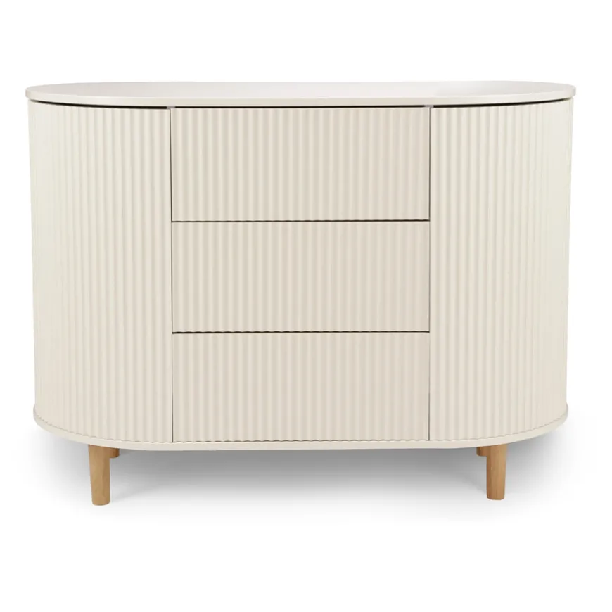 - Die Kommode besitzt zwei Schränke mit Zwischenboden und drei Schubladen. Alle Elemente besitzen einen Easy-Touch-Verschluss. Leichter Druck genügt und schon öffnet sich Schranktür oder Schublade.