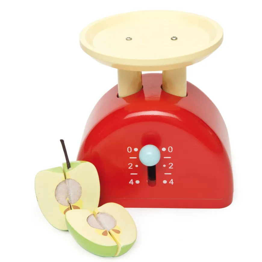 In der roten Le Toy Van-Küchenwaage wiegt das Puppenmütterchen die Zutaten ab für einen leckeren Apfelkuchen. Oder wird es süße Marmelade? Die Küchenwaage von Le Toy Van zeigt zuverlässig die Mengen an. Den grünen Apfel können die kleinen Köche jedesmal aufs Neue teilen, und mit dem Klettverschluss wieder zusammen setzen.