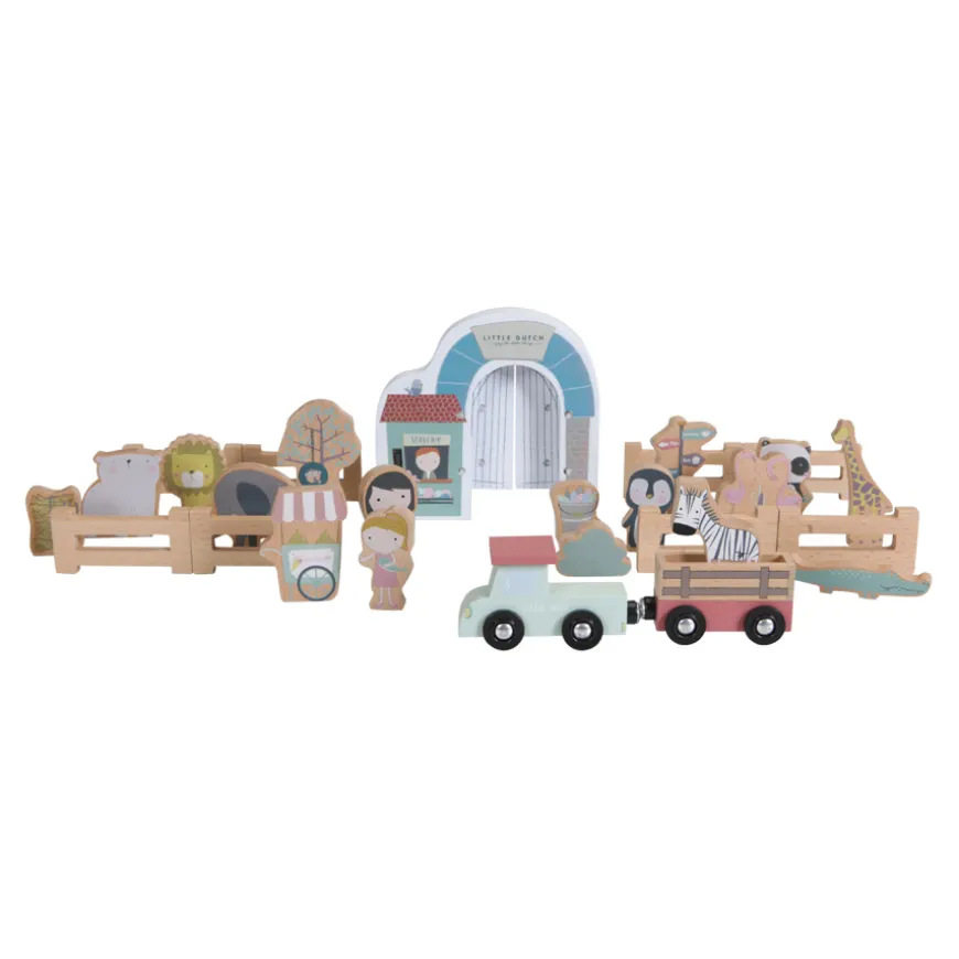 Hurra, die bezaubernde Holzeisenbahn von Little Dutch hat in einem traumhaft schönen Zoo Halt gemacht! Hier gibt es Löwen, Bären, Zebras, Giraffen und viele weitere aufregende Tiere, die sich schon auf Besuch freuen. Natürlich darf auch ein Stand mit leckerem Eis nicht fehlen. Diese wunderschöne Erweiterung für die Holzeisenbahn von Little Dutch ist ein Garant für viel Spiel und Spaß.