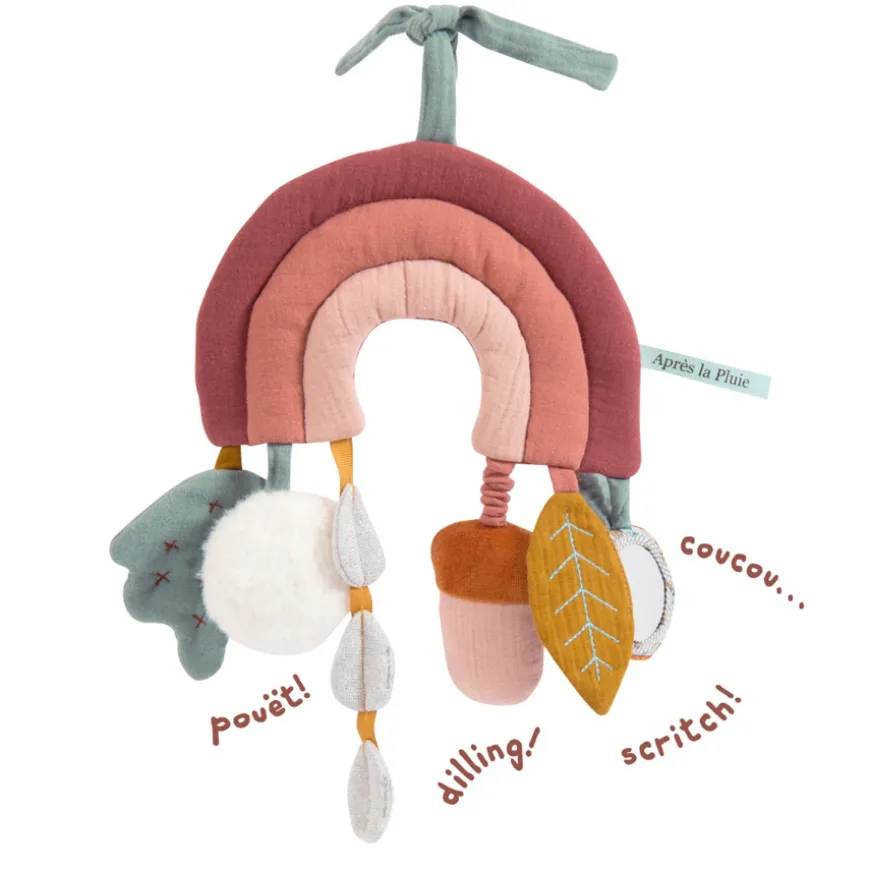 Der Moulin Roty Aktivitäten Regenbogen lädt die Kleinen zum Entdecken ein. Vor allem können sie an den Anhängern in unterschiedlichen Formen Tasten und Greifen trainieren. Was gibt es Schöneres für Babys, die Welt zu entdecken und dabei selbst aktiv zu werden? Damit der Regenbogen von Moulin Roty im Bettchen oder Kinderwagen in greifbarer Nähe ist, lässt er sich mithilfe der angenähten Bändchen überall befestigen.