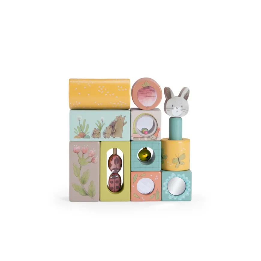 Liebevoll entworfen und illustriert: Moulin Roty Entdecker-Bausteine Trois Lapins 11-teilig.
