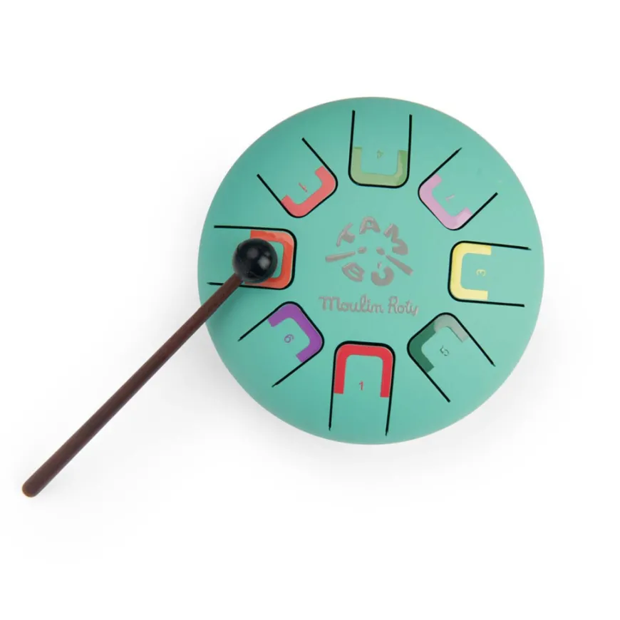 Die kleine Moulin Roty Zungentrommel ist der ideale Einstieg, um Kinder an Schlaginstrumente heranzuführen. Die acht Töne der Moulin Roty Trommel können auf verschiedene Arten gespielt werden: mit Drumsticks, den Händen oder Fingerpicks.