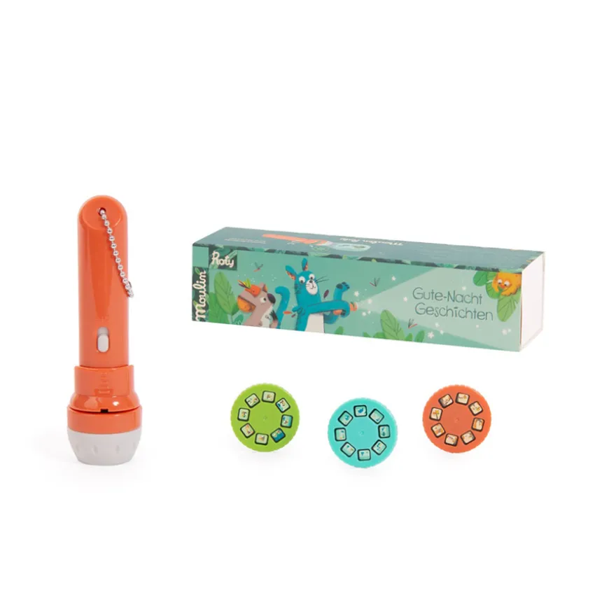 Wenn es abends an der Zeit ist, sich ins Bett zu kuscheln, um die Reise ins Land der Träume anzutreten, darf eine fantasievolle Gute Nacht Geschichte nicht fehlen – oder? Mit dieser wunderschönen Leuchte von Moulin Roty lassen sich bezaubernde Motive an die Wand oder die Decke projizieren, zu denen sich immer wieder neue Geschichten erfinden lassen. Die Projektionsleuchte von Moulin Roty ist der perfekte Einschlafbegleiter.