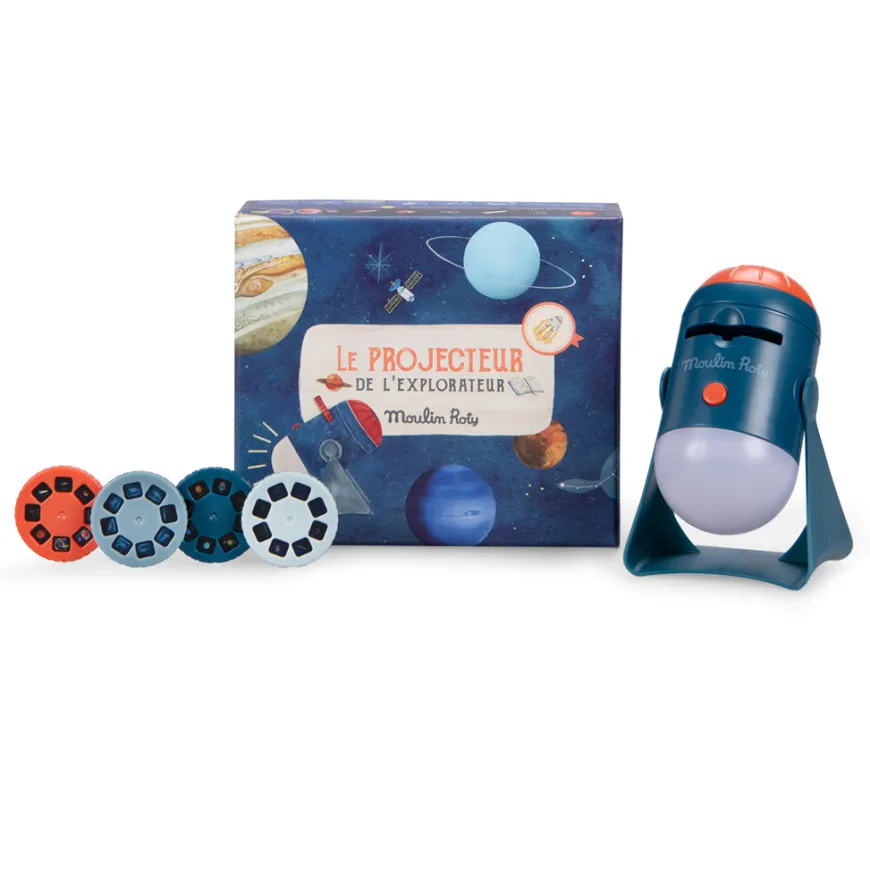 Der Projektor für junge Entdecker von Moulin Roty erweist sich als lehrreich und spannend zugleich. Im dunklen Kinderzimmer lassen sich wunderschöne Himmelsbilder an die Wand projizieren. Zu den hübschen Projektionen von Moulin Roty lassen sich Geschichten erzählen, Planeten entdecken oder einfach träumen.