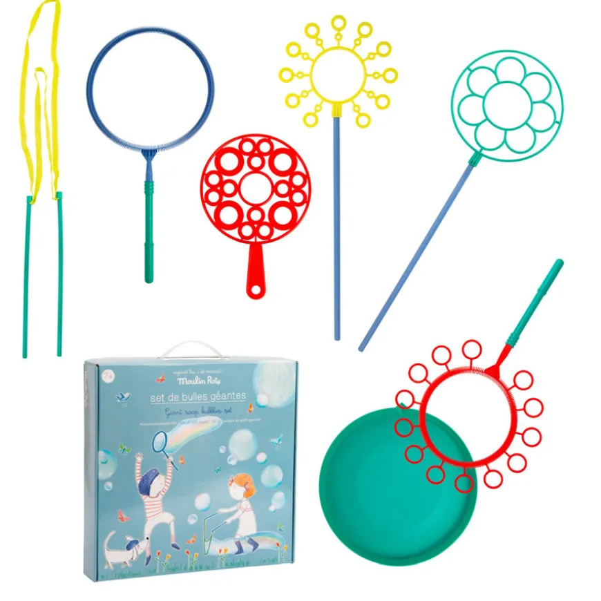 Das Riesenseifenblasen-Set von Moulin Roty besteht aus einer Schale für die Seifenlauge sowie aus mehreren Formen mit Stiel, sodass sich damit große und kleine Blasen kreieren lassen. An einem warmen Sommertag sorgt das Set von Moulin Roty für jede Menge Spielspaß unter freiem Himmel.