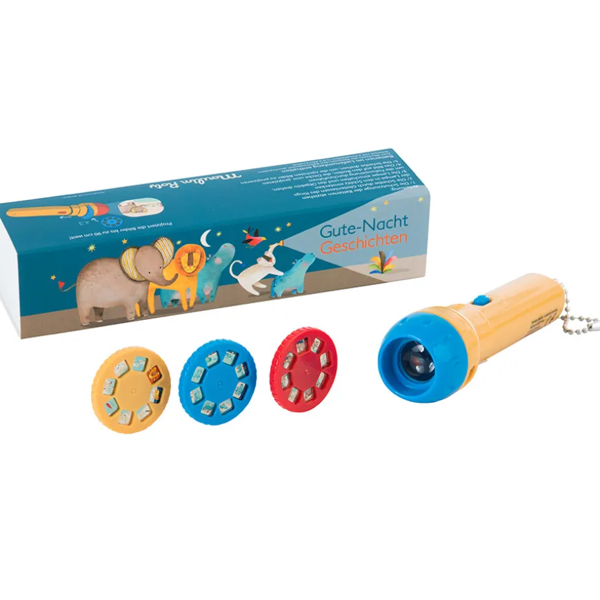 Mit der Moulin Roty Taschenlampe Märchenstunde fallen Kinder wunderschöne und fantasievolle Geschichten ein, die sie sich gegenseitig oder ihren Eltern, Geschwistern und Großeltern erzählen können. Dazu wird einfach das Bildrondell in die Taschenlampe eingelegt. Sobald an der Taschenlampe gedreht wird, erscheint das nächste Bild. Mit Moulin Roty erleben Kinder einfach überall spannende Abenteuer.