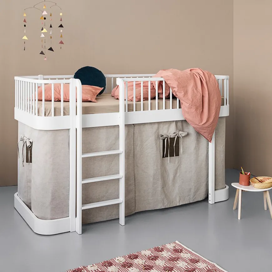 Schon erstaunlich, was so ein Stück Stoff aus einem Bett machen kann: Ist es nun eine Höhle, eine Burg oder gar ein Schiff? Egal! Dank dieser Vorhänge verwandelt sich das halbhohe Hochbett „Wood“ von Oliver Furniture im Handumdrehen in das absolute Traumbett! Diese passenden Vorhänge umschließen den Unterraum des Bettes an drei Seiten und schaffen dort eine wunderschön abgetrennte Welt zum Spielen oder Verstecken. Die Montage erfolgt mit Klettband sowie mit Vorhangdraht. Alle Vorhänge werden in Dänemark genäht und sind bei 40 °C in der Machine waschbar.